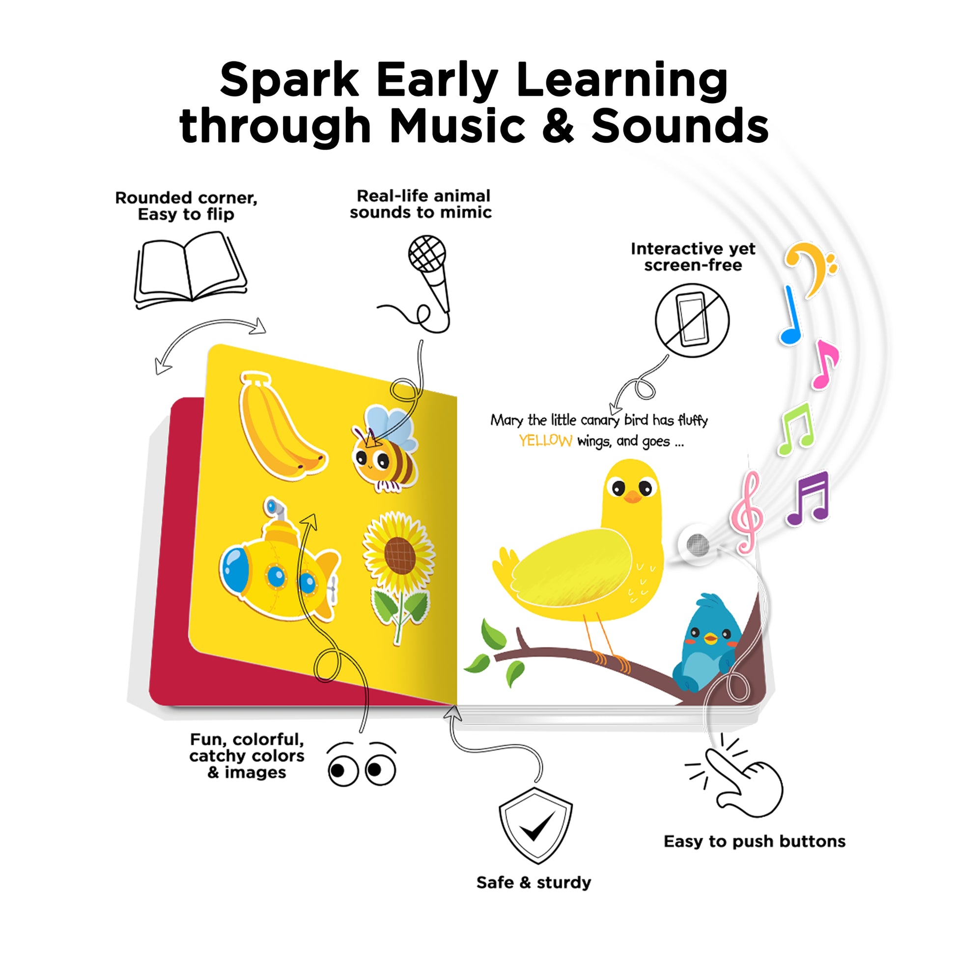 - 5 interactive buttons to press, 5 songs to listen to
